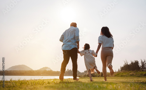 Happy family in the park sunset light. family on weekend running together in the meadow with river Parents hold the child hands.health life insurance plan concept.