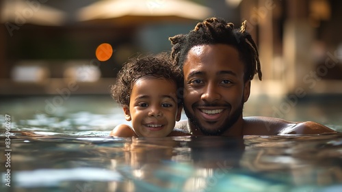 Happy Father and Child Enjoying a Pool Day Together smiling as they bond.
