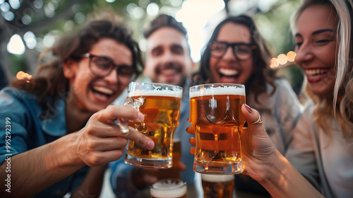 Happy friends celebrating drinking beer pint at park outdoor - Young people talking and laughing together at brewery pub garden - Friendship, youth and beverage concept