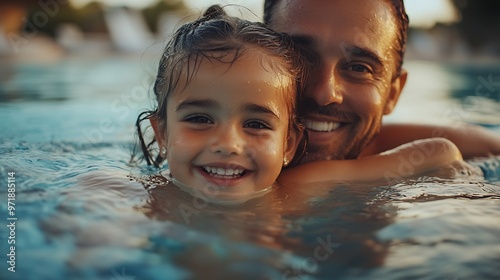 Happy girl embracing father while swimming in pool at resort during vacation : Generative AI