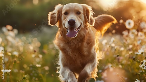 Happy Golden Retriever running through meadow with dandelions at sunset, backlit by golden sunlight creating magical atmosphere, dog enjoying nature outdoors.