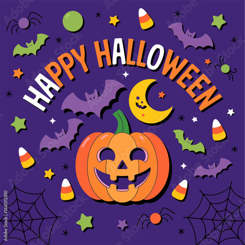 Happy Halloween circle design with pumpkin, web and candy, bats and moon, purple vector