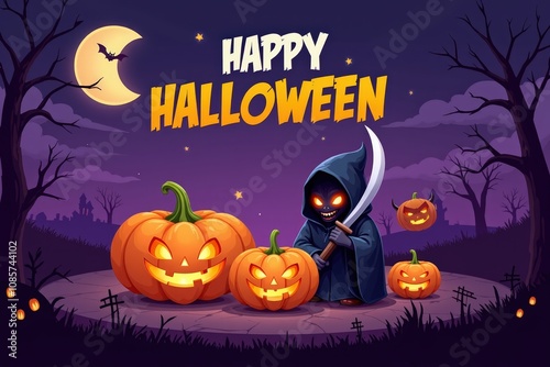 Happy halloween night: spooky scene with pumpkins and grim reaper character under moonlit sky.