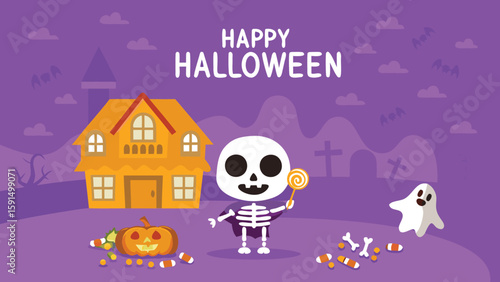Happy halloween scene with house, skeleton, ghost, pumpkin, candy and graveyard in purple background