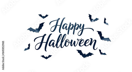 Happy Halloween text design with bats on a solid black background for October holiday