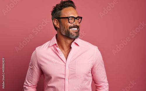 happy handsome fashion businessman smiling and wearing color shirt, solid light color background