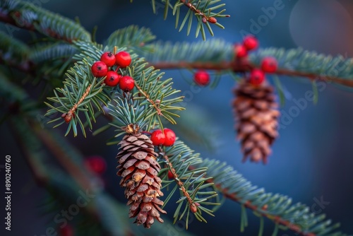 Happy Holidays Red. Christmas Concept with Evergreen Tree Branch and Pine Cone Decor
