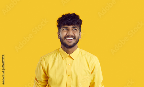 Happy Indian guy with funny expression is thinking about new good opportunities or imagining something nice. Close up of positive funny young man in yellow shirt looking away vivid yellow background