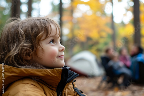 Happy kid girl in an autumn forest enjoying a weekend camping trip with family among colorful fall leaves, generative ai