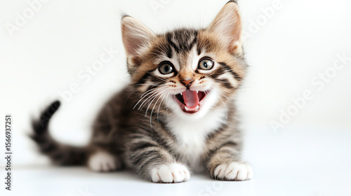 Happy kitten with raised tail and open mouth, joyful expression, clean white setting