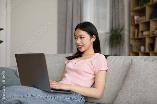Happy korean woman freelancer sitting on sofa, typing on laptop keyboard and smiling, home interior, free copy space