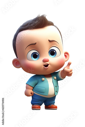 happy little baby boy points his finger at isolated background. Cartoon character. Generative AI illustration