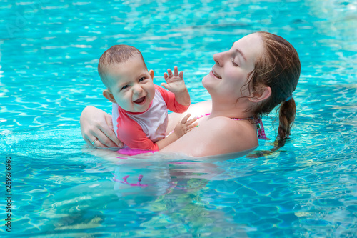 Happy little child with mom, First time in a large pool and very impressed. Very happy and frolic.