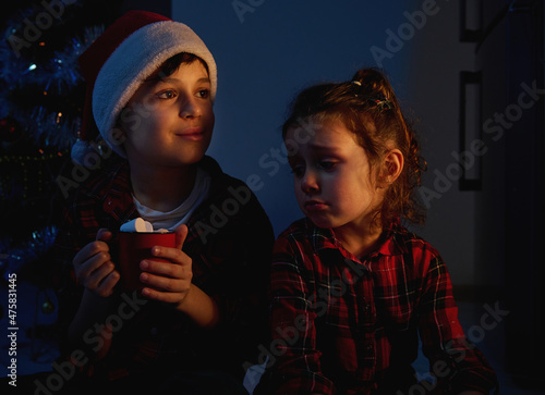 Happy loving brother in Santa hat and his adorable younger sister, boy and girl drinking cocoa drink with marshmallows, sitting on the floor by the oven with German Stollen Christmas bread inside it