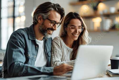 Happy male and female managers using laptop together in a modern office wearing casual clothing and glasses smiling at computer screen in meeting room with minimalist style sharp focus high detail