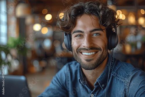 Happy Middle Eastern man wearing headset talking to customer on video call working as telemarketer or sales agent in office using laptop for online conversation and telecommunication
