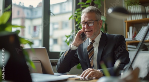 Happy middle-aged businessman executive wearing a suit and glasses talking on the cell phone while working at his desk in the office. he is satisfied with signing a business contract with the buyer