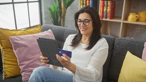Happy middle-aged woman shopping online with credit card and tablet in modern living room.