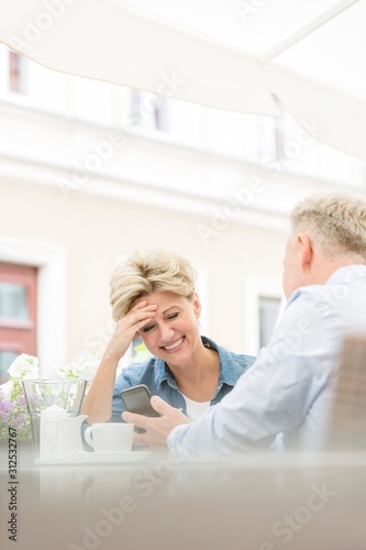 Happy middle-aged woman using mobile phone with man at sidewalk cafe