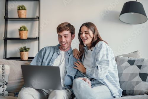 Happy millennial couple smiling looking at laptop screen making video call, young man and woman customers using computer applications for online shopping or booking sitting on sofa embracing.