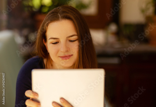 Happy mixed race millennial girl sitting on comfortable coach in living room, using tablet applications, shopping, playing online games, chatting with friends, watching funny videos, head shot.