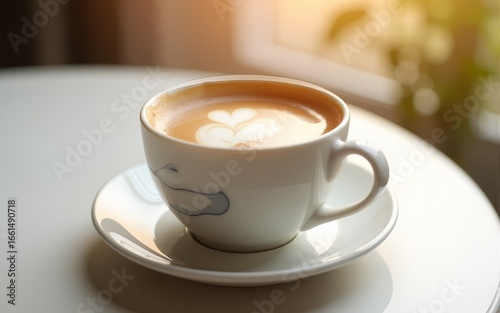 Happy morning with delicious coffee. Warm coffee in a stylish cup on a light surface. High quality