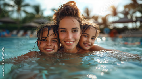 Happy Mother and Two Children Enjoying Fun Family Time at the Swimming Pool