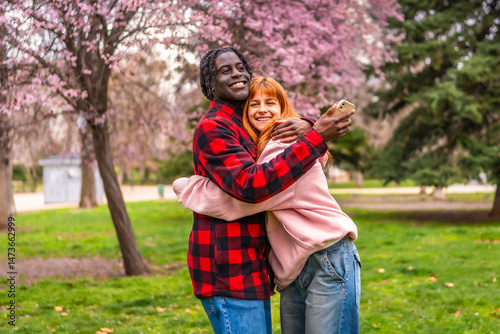Happy multiracial couple embracing and taking selfie in blooming park