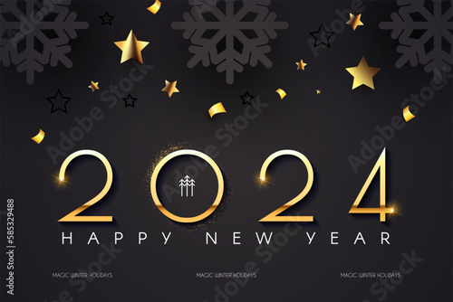 Happy new 2024 year Elegant gold text with confetti and smowflakes. Minimal text template