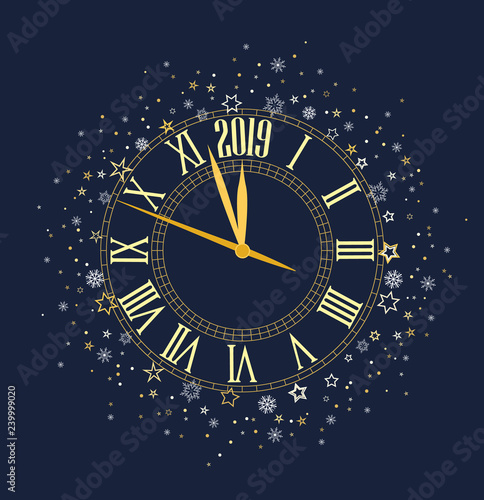 Happy New Year 2019, vector illustration Christmas background with clock showing year