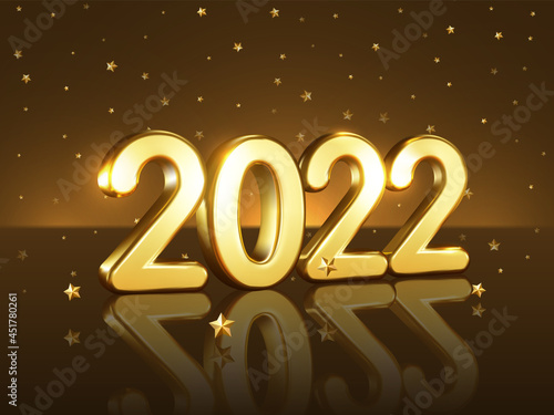 Happy New Year 2022. Realistic gold numbers on a dark gold background with stars. Vector illustration.