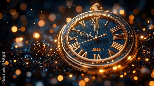 Happy New Year 2025 Card Banner with Gold Numbers and Clock on Dark Blue Background with Bokeh Lights and Stars