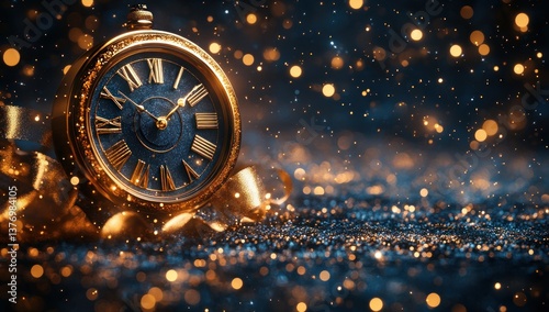 Happy New Year 2025 Celebration Card with Golden Numbers and Clock on Blue Background with Glitter and Bokeh Effects