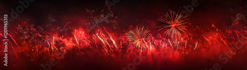 happy new year, new year's eve, silvester, new year, festival, greeting card, new year card long panorama - red fireworks firework pyrotechnic pyrotechnics, on black night sky background