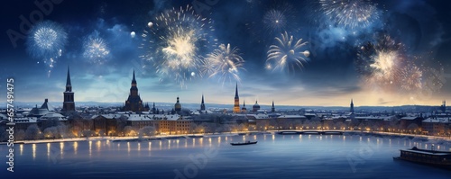 Happy new year snowy city with fireworks Generative AI