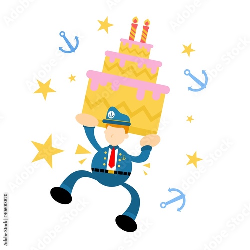 happy sailor captain navy and birthday cake cartoon doodle flat design style vector illustration