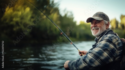 Happy senior fisherman with fishing rod enjoying fly fishing in river, smiling and looking at camera on a sunny day, surrounded by beautiful nature