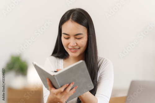 Happy smart asian woman freelancer working with laptop while live in the room.