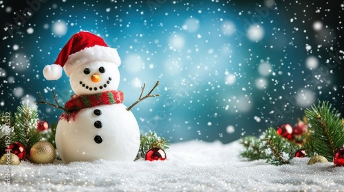Happy snowman standing in christmas landscape. Snow background with copy space