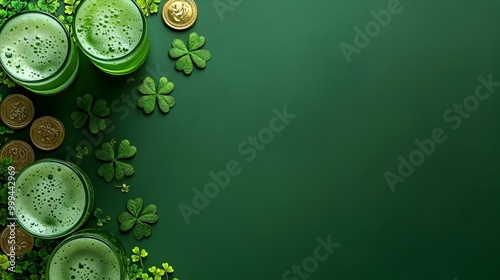 Happy St Patrick s Day Banner Template with Shamrocks Gold Coins and Green Beer on Green Background