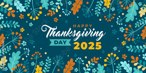 Happy thanksgiving day 2025. Vector banner, greeting card with text Happy thanksgiving day, pumpkin, and wreath for social media. Vignette, frame, garland with orange flowers on green background.
