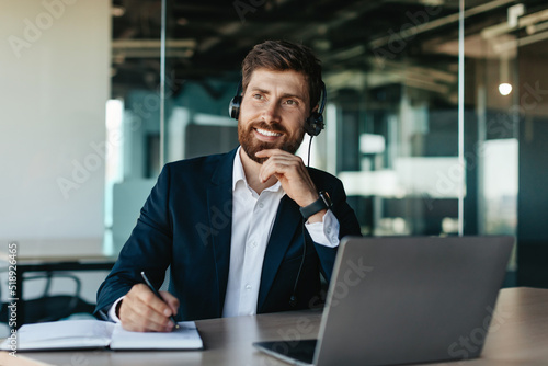 Happy thoughtful businessman in headset working on laptop and writing in notebook, sitting at desk in office interior