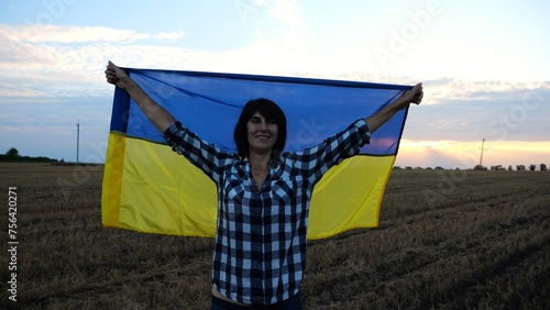 Happy woman looks into camera standing on wheat field with a lifted blue-yellow banner at sunset. Ukrainian smiling lady posing with a raised over head flag of Ukraine on barley meadow at sunrise.