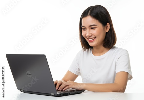 Happy Woman Working on Laptop Computer