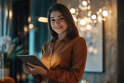 Happy young businesswoman standing in a modern office, holding a tablet and looking away with a confident smile. Professional female executive leader, career success concept
