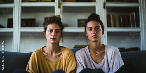 Happy young lesbian couple hugging having fun, Sitting on the sofa. Generative AI.