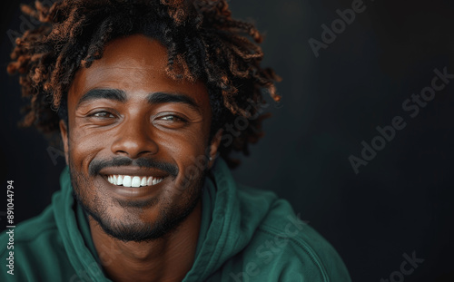 Happy young man wearing green sweatshirt, laughing, smiling, isolated on dark background
