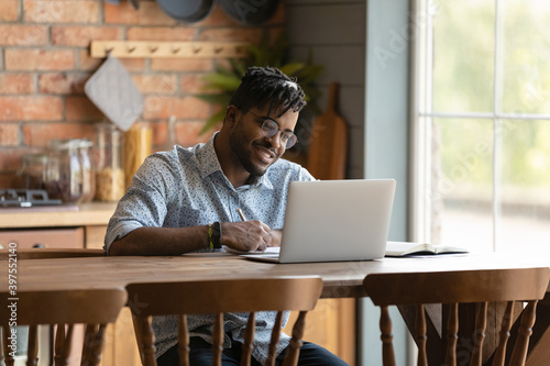 Happy young mixed race man sitting at table, enjoying learning distantly on online courses, using computer at home. Smiling 30s businessman in eyewear improving knowledge, watching webinar lecture.