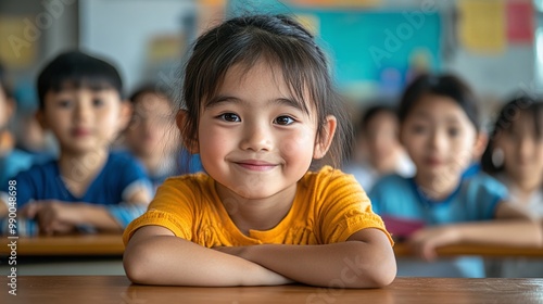 happy young students in asia attending a classroom lesson, backtoschool day with focused asian children, engaged in learning and serious academic participation in a supportive environment