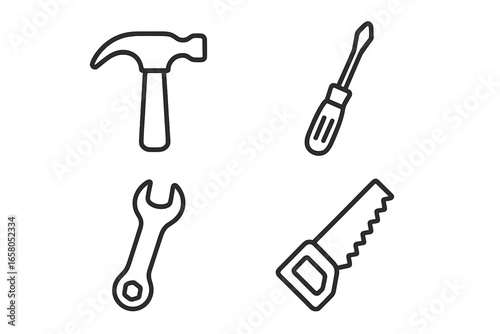 Hardware tools outline icon set. Hammer, screwdriver, wrench, and saw linear icons. Handyman essentials for DIY projects. Vector graphic for construction and repair themes.